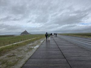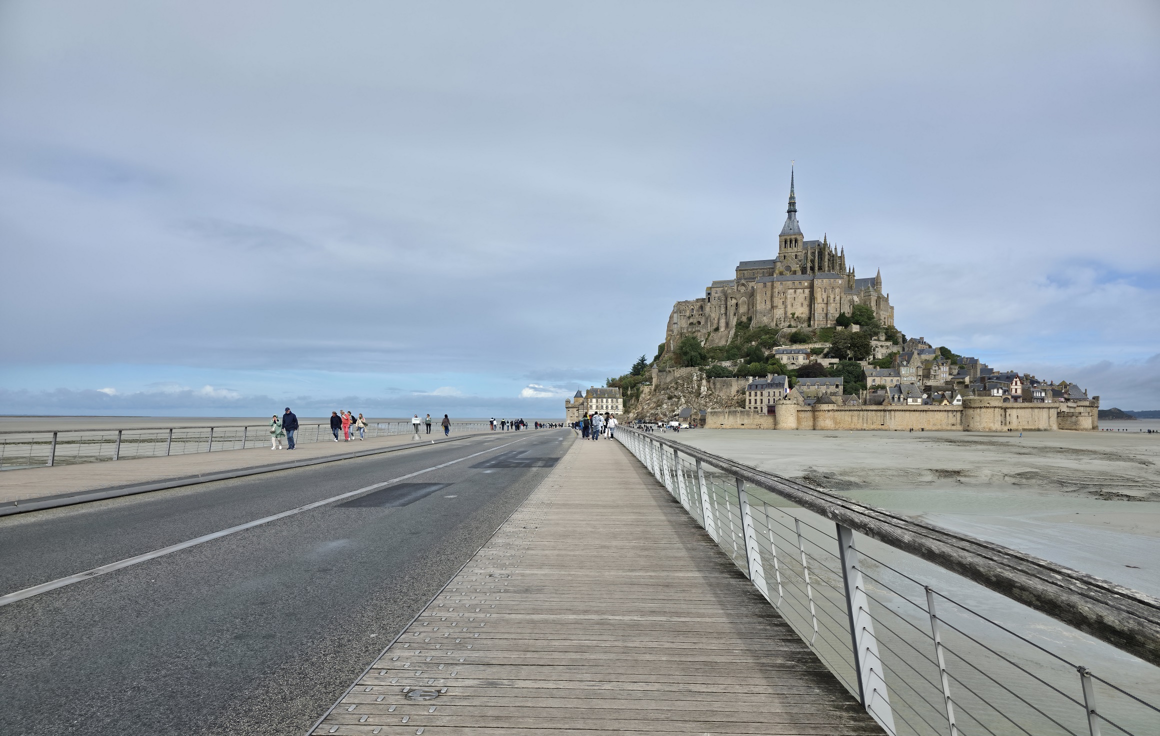 Při hledání parkoviště jsme nejprve omylem zajeli na místo určené pro elektroauta, než jsme našli správné – parkoviště P10. Na Mont Saint-Michel jsme se vydali pěšky, kyvadlový autobus jsme nevyužili. I přes nepříznivé počasí mířily k ostrovu davy lidí.