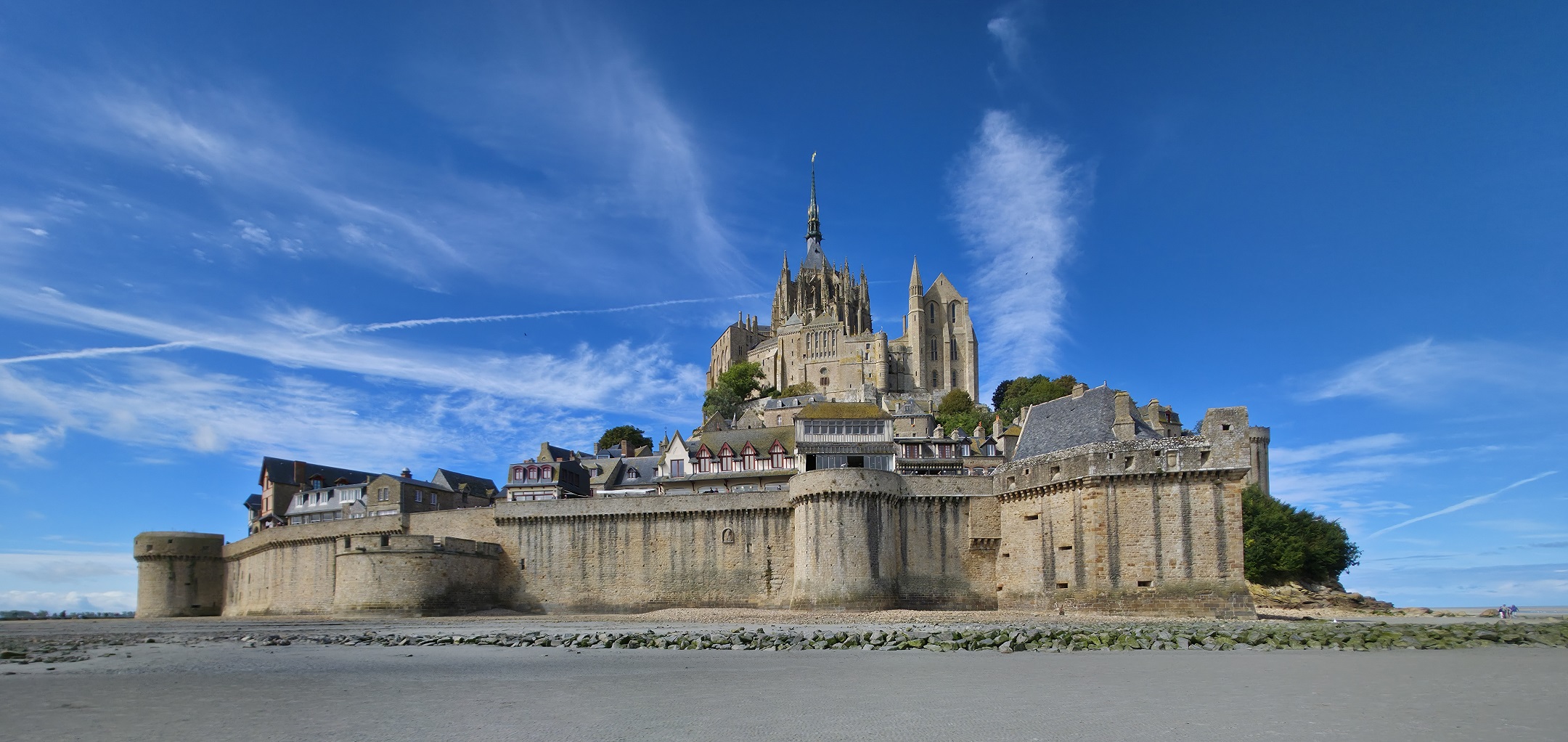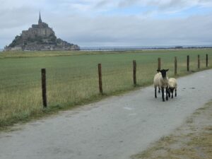 Byl odliv, takže jsme si mohli ostrov obejít a vyfotit z „moře“. Voda byla tak daleko, že nebylo vidět moře vůbec – rozdíl mezi přílivem a odlivem je tu největší v Evropě, až 15 metrů. Při přílivu ostrov zcela obklopí moře, voda se valí rychlostí až 15 km/h. Říká se: „Jdeš-li na Mont Saint-Michel, sepiš závěť…“