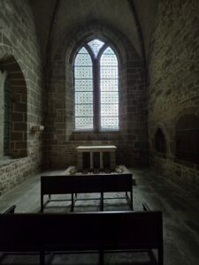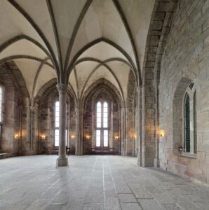 Nejhezčí byla Křížová chodba. Chodbu obklopuje krytá galerie s jemně tesanými oblouky a 137 sloupi, které tvoří“ trojnožky“. Chodba sloužila mnichům k rozjímání , zahrada uprostřed byla místem klidu. Další zajímavou místností byl reflektář ( jídelna). Spolu s křížovou chodbou je částí opatství zvané „ La Merveille“ ( zázrak) . Sloužil jako jídelna pro mnichy, kam přicházeli několikrát denně ke společnému jídlu a rozjímání. Pokračovali jsme do Salle des Hotes . je rozdělena do dvou lodí pomocí šesti osmihranných sloupů . Krásné jsou detaily na sloupech jako jemné listové motivy na hlavicích sloupů. Na jedné straně jsou dva ohromné krby, které sloužily k přípravě jídla a ty oddělovala stěnová tapisérie. Místnost byla určena pro hosty nejvyššího postavení, které byli přijímáni se vším komfortem své doby, včetně latrín v blízkosti místnosti. Mimochodem i dnes jsou tu záchody pro návštěvníky.